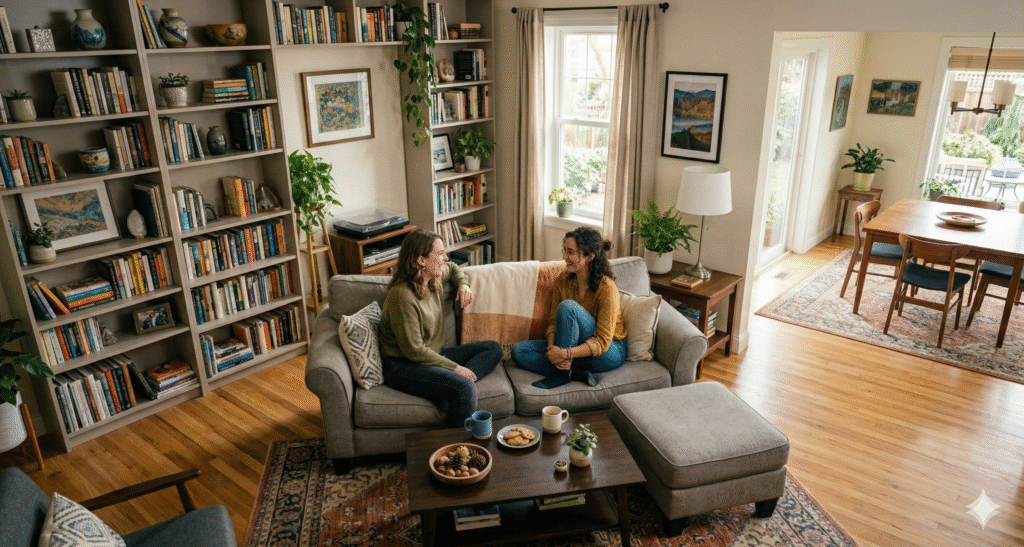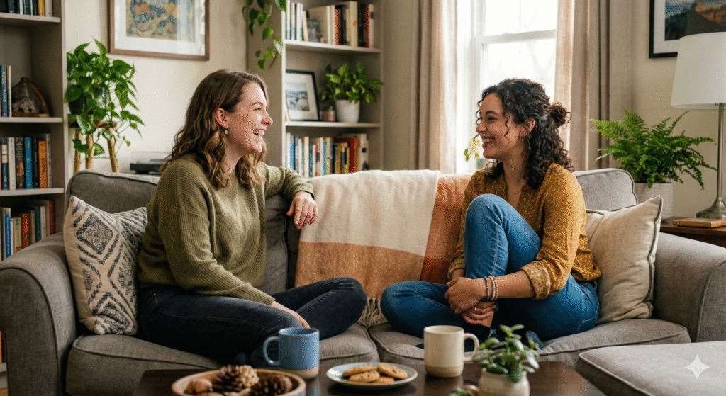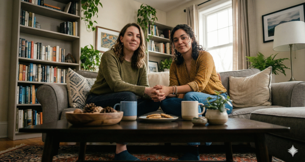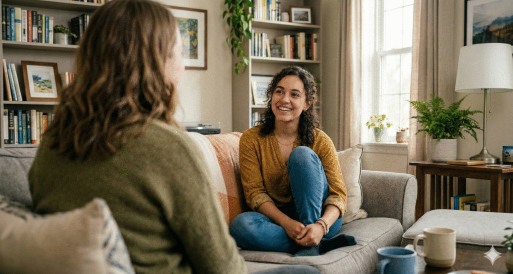The Prompt: Photorealistic over-the-shoulder shot of the subject having a conversation with a man. Man in blurred foreground. Subject in sharp focus seated across a coffee table making eye contact. 50mm lens, f/2 shallow depth of field, soft window light, documentary lifestyle vibe.