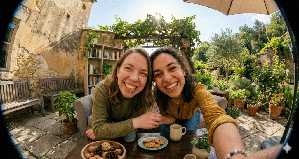 The Prompt: Photorealistic ultra-wide fisheye portrait shot viewed through a circular opening, creating a strong round vignette frame. Subject is leaning in close making an OK gesture around the eye. 8mm fisheye, f/5.6 deep depth of field, midday sunlight with clear sky reflections, punchy contrast.