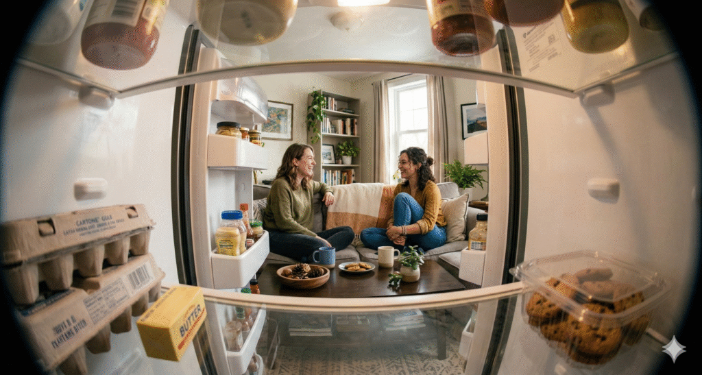 The Prompt: Cinematic “In-Fridge” POV shot looking out from inside a refrigerator. The camera is placed behind glass bottles and food containers. The subject opens the fridge door, their face illuminated by the cool internal fridge light against a dark kitchen background. Low angle, wide-angle lens.