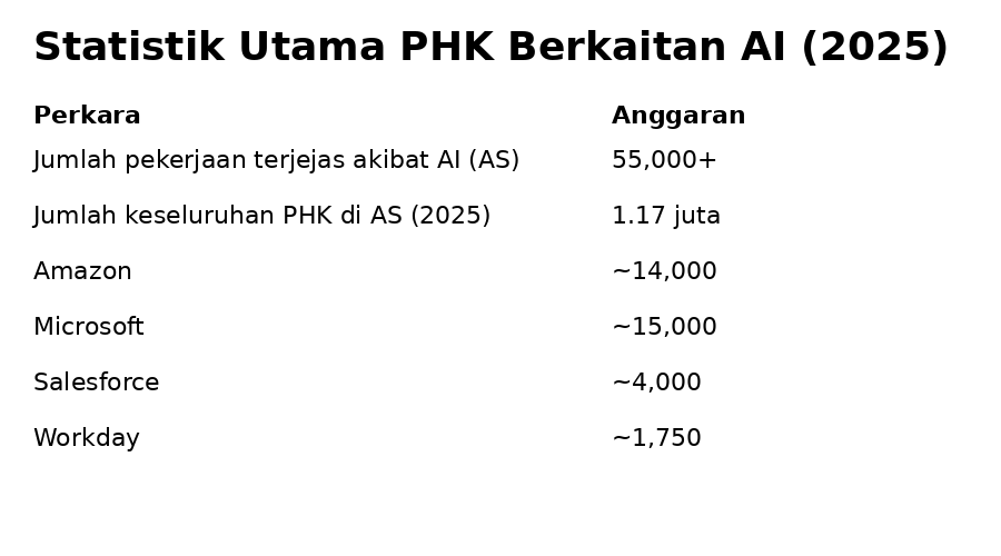 Tahun 2025 menyaksikan PHK berlaku kepada lebih 55,000 pekerjaan di Amerika Syarikat dipotong dengan Artificial Intelligence (AI) disebut secara langsung sebagai punca utama. Syarikat gergasi seperti Amazon, Microsoft, Salesforce dan Workday mengakui bahawa automasi dan AI telah mengubah struktur tenaga kerja mereka secara besar-besaran.