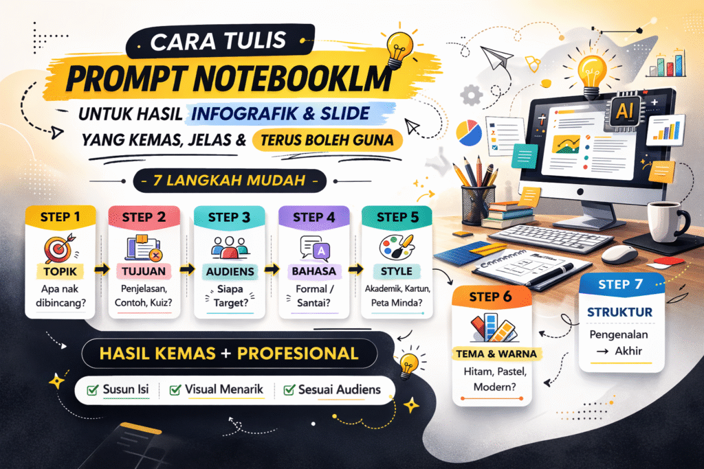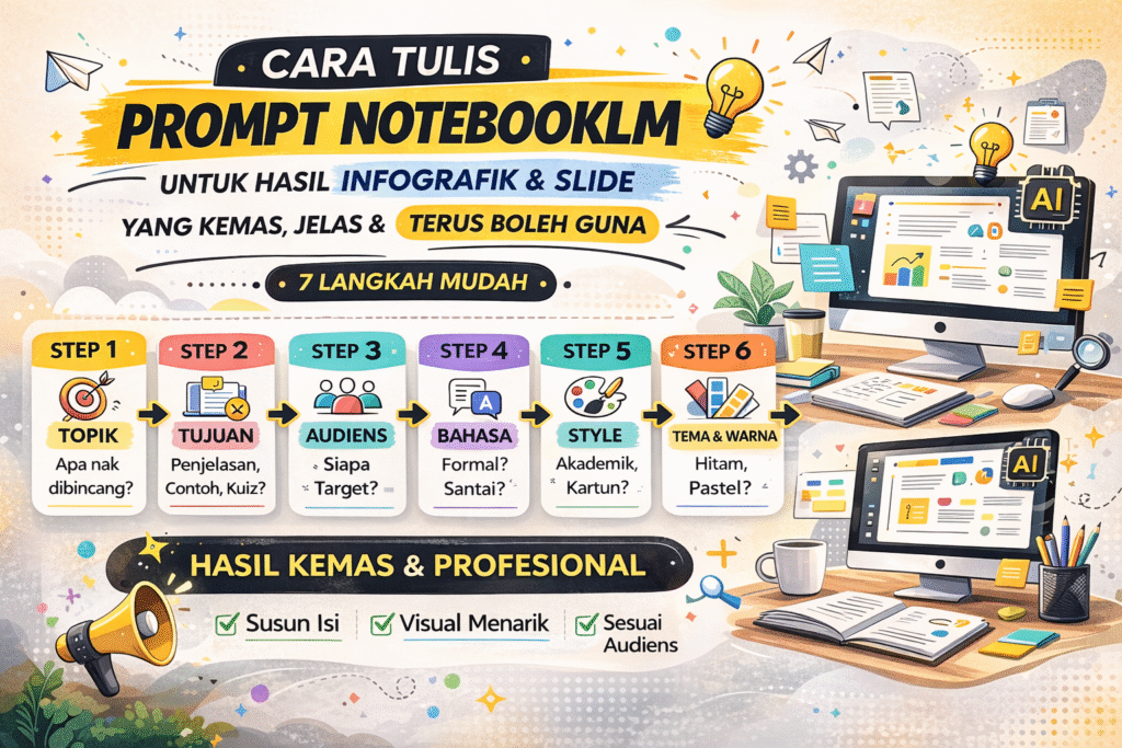 Dalam artikel ini, saya kongsikan framework lengkap tulis prompt NotebookLM supaya infografik dan slide anda nampak lebih terancang, menarik dan terus boleh guna tanpa banyak edit.