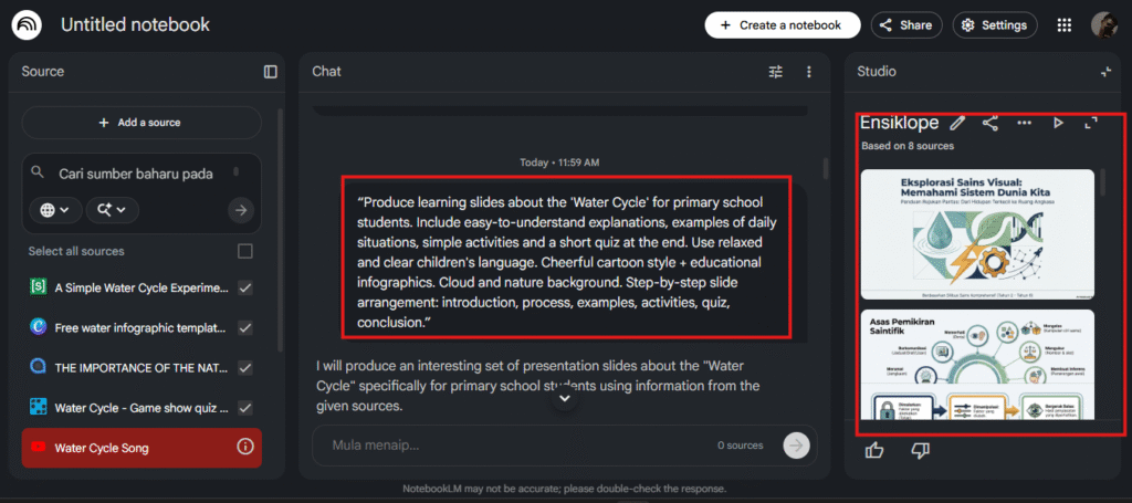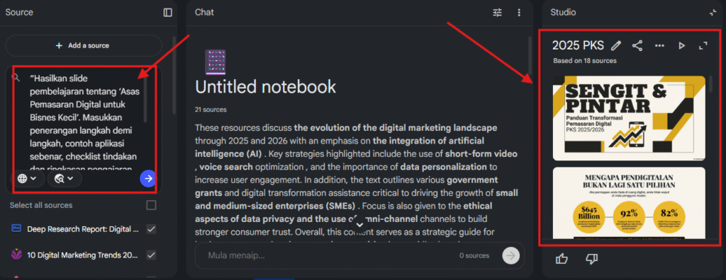 Cara Tulis Prompt NotebookLM ramai yang dah mula guna NotebookLM untuk hasilkan bahan pembelajaran, infografik dan slide automatik.