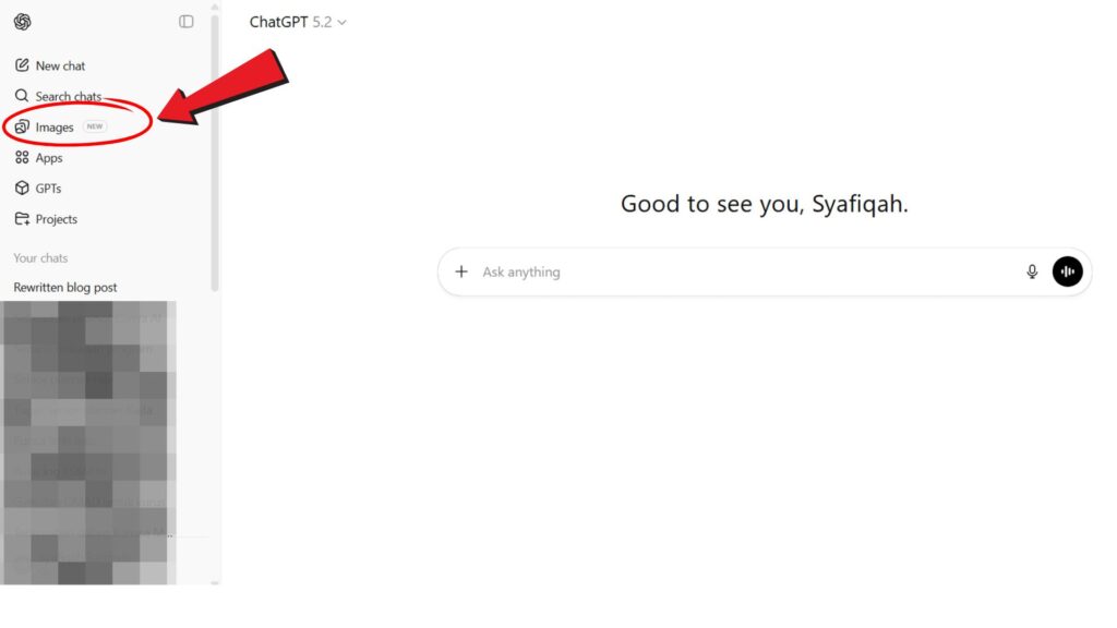 After logging into ChatGPT, you’ll notice a new “Images” tab on the left sidebar. Click it to open the image dashboard.