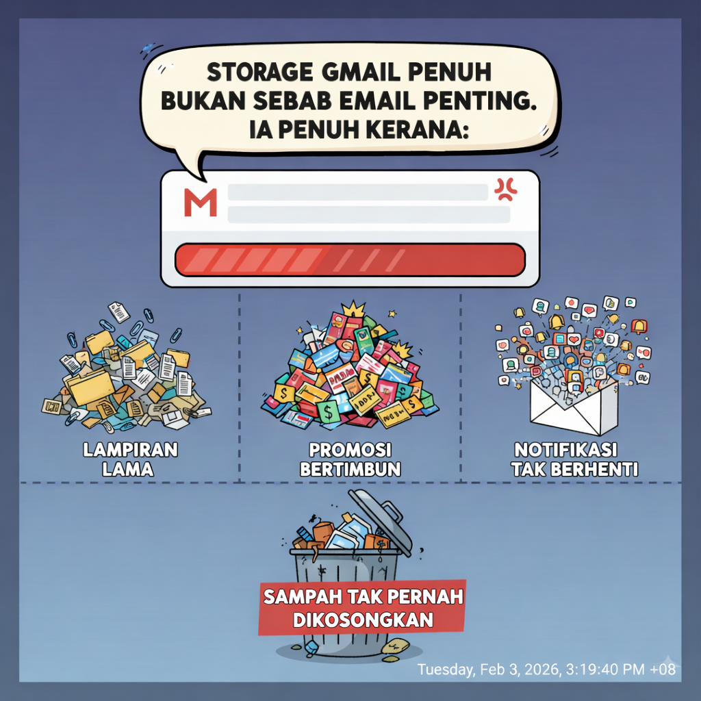 Storage Gmail penuh bukan sebab email penting. Ia penuh sebab: