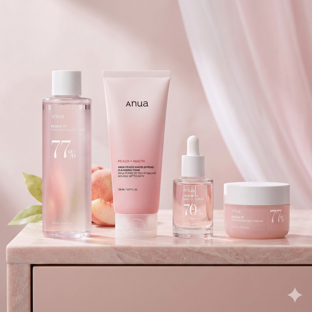 Combine these product images into one professional advertising scene. Arrange the products neatly on a modern studio table with soft lighting and a clean background. Ensure consistent lighting, realistic shadows, and balanced composition so the products look like they were photographed together in a professional product photoshoot. Selepas: