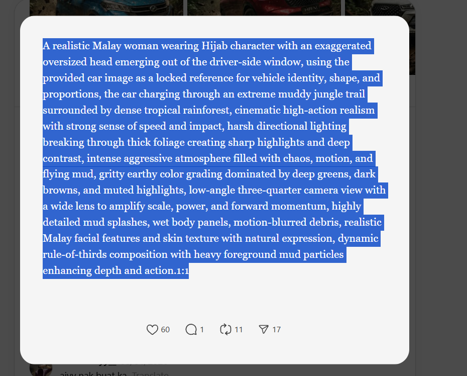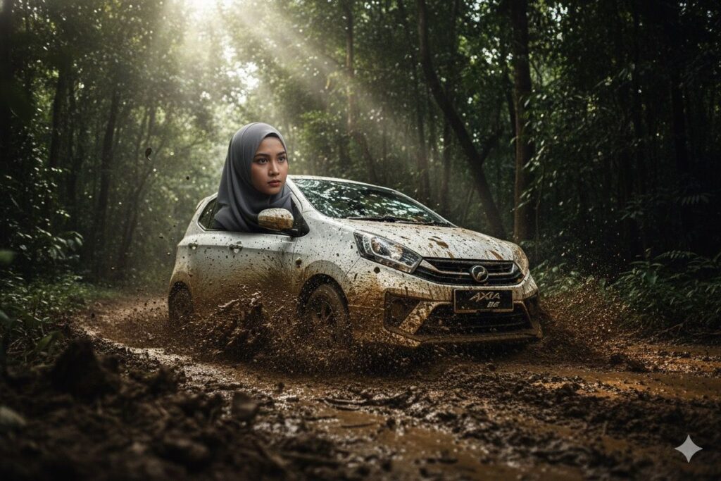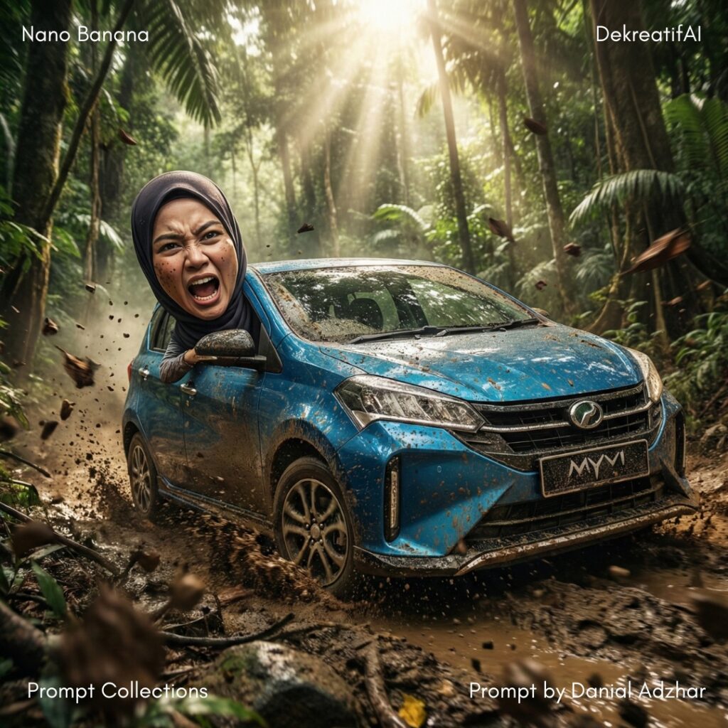 A realistic Malay woman wearing Hijab character with an exaggerated oversized head emerging out of the driver-side window, using the provided car image as a locked reference for vehicle identity, shape, and proportions, the car charging through an extreme muddy jungle trail surrounded by dense tropical rainforest, cinematic high-action realism with strong sense of speed and impact, harsh directional lighting breaking through thick foliage creating sharp highlights and deep contrast, intense aggressive atmosphere filled with chaos, motion, and flying mud, gritty earthy color grading dominated by deep greens, dark browns, and muted highlights, low-angle three-quarter camera view with a wide lens to amplify scale, power, and forward momentum, highly detailed mud splashes, wet body panels, motion-blurred debris, realistic Malay facial features and skin texture with natural expression, dynamic rule-of-thirds composition with heavy foreground mud particles enhancing depth and action.1:1